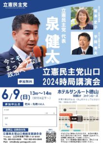 立憲民主党山口は、泉健太立憲民主党山口代表を迎え、「2024時局講演会」を6月9日(日)午後1時より、ホテルサンルート徳山(TEL0834-32-2611)別館2Fコットンローズで開催します。