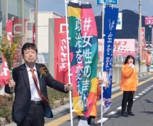 玉井伸昌・周南市議選予定候補者は、主にジェンダー平等指数ランキングを紹介しつつ、普段の生活でのジェンダー意識について等を、それぞれ訴えました。