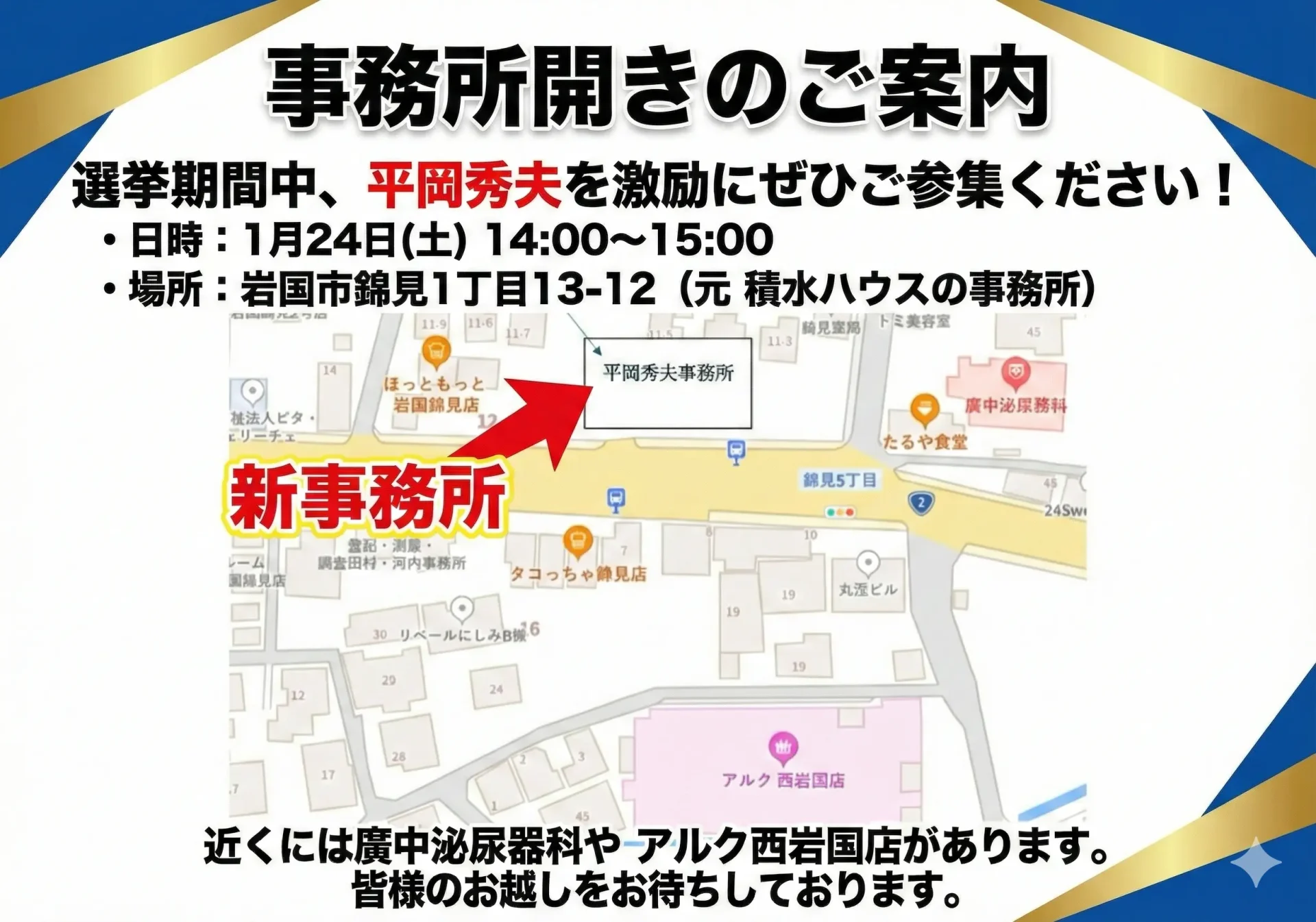 - 場所: 平岡秀夫 選挙事務所